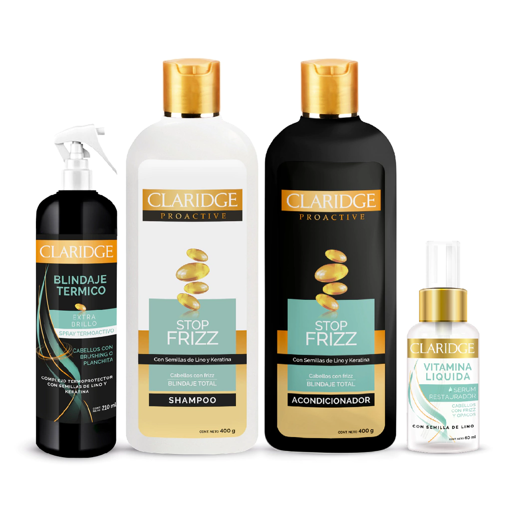 EL KIT CONTIENE: Shampoo Stop Frizz Acondicionador Stop Frizz Spray termoactivo Serum Serum Vitamina Líquida Claridge desarrollo su nueva fórmula STOP FRIZZ, combinando las propiedades humectantes e hidratantes de las Semillas de Lino con el poder de reparación de la Keratina, para que el cabello recupere su textura y brillo natural. Es un tratamiento intensivo formulado para reparar y devolver los niveles de hidratación y humectación perdidos en la fibra capilar.